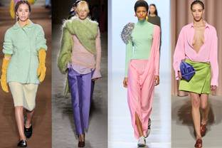 FW24 秋冬系列的色调大体上比较低沉。秋季色调、各深灰色以及橄榄卡其色等色调大行其道,迎合当下流行的 "静谧奢华 "趋势。 L-R: Alberta Ferretti, Emilia Wickstead, Schiaparelli FW24 Credits: Alberta Ferretti, Emilia Wickstead, Schiaparelli FW24/©Launchmetrics/spotlight 而当色彩出现,则大鸣大放。其中一种特别的鲜红色在四大城市都很流行。 另一方面,有几位设计师偏离了传统的秋季色调,创造出融合柔和色彩的造型。其中,两三种绿色被用来作为造型的主色调,给人耳目一新的感觉。与绿色调相关的协调色或冲突色包括中性色、粉色、淡紫色和赭石色。 Midali...