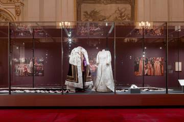紫色天鹅绒御礼袍与国王的奶油色丝绸罩衫和紫色加冕长衫一起展出,这两件长袍是 Ede and Ravenscroft